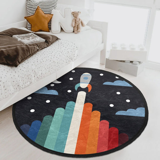 Space Rocket Kids Room Area Rug, Nursery Room Space Patterned Round
