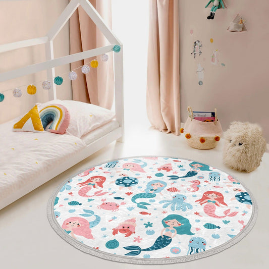 Mermaid Printed Kids Room Round Rug, Mermaid Girls Bedroom Decorative