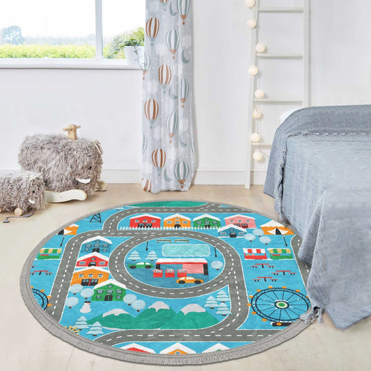 Plane-Car-Train Printed Kids Room Round Rug, Nursery Room Area Carpet,