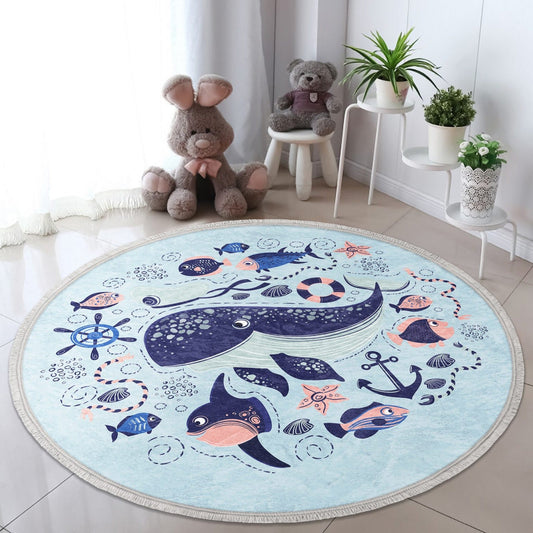 Ocean Animals Print Nursery Room Round Rug, Nonslip Kids Room Circle