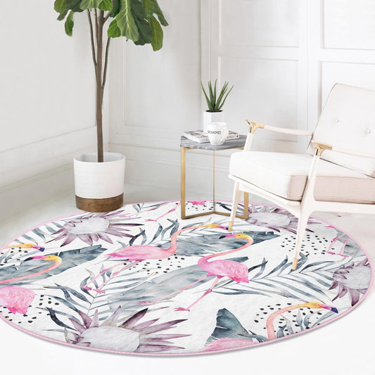 Floral and Flamingo Patterned Decorative Round Rug, Living Room